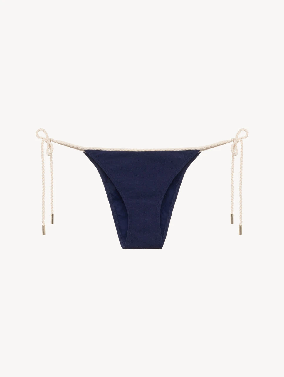 Mêlant élégance, sophistication et esprit nautique contemporain, le bas de maillot de bain bleu La Perla Signature est rehaussé de l’emblématique monogramme LP en jacquard stretch de couleur assortie. Avec sa coupe chic et moderne qui sublime impeccablement la silhouette, il est rehaussé d’un cordonnet de couleur contrastée nouable sur les côtés, qui lui donne un indémodable style resort. Portez-le avec les soutiens-gorge de bain bandeau ou triangle coordonnés pour compléter le look.