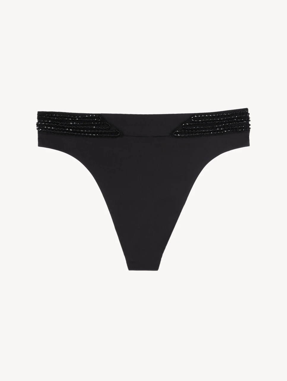 Expression d’une extrême sophistication et d’un savoir-faire exceptionnel, le bas de maillot de bain tanga à taille haute noir Luci Di Capri puissamment féminin présente une ligne impeccable qui sublime la silhouette. Réalisé dans une douce et luxueuse microfibre stretch qui sculpte et sublime la silhouette à la perfection, il est rehaussé d’une délicate garniture ondoyante de perles noires brodées sur tulle avec notre technique soutache. Portez-le avec le soutien-gorge de bain bandeau ou triangle Luci Di Capri pour compléter le look.
