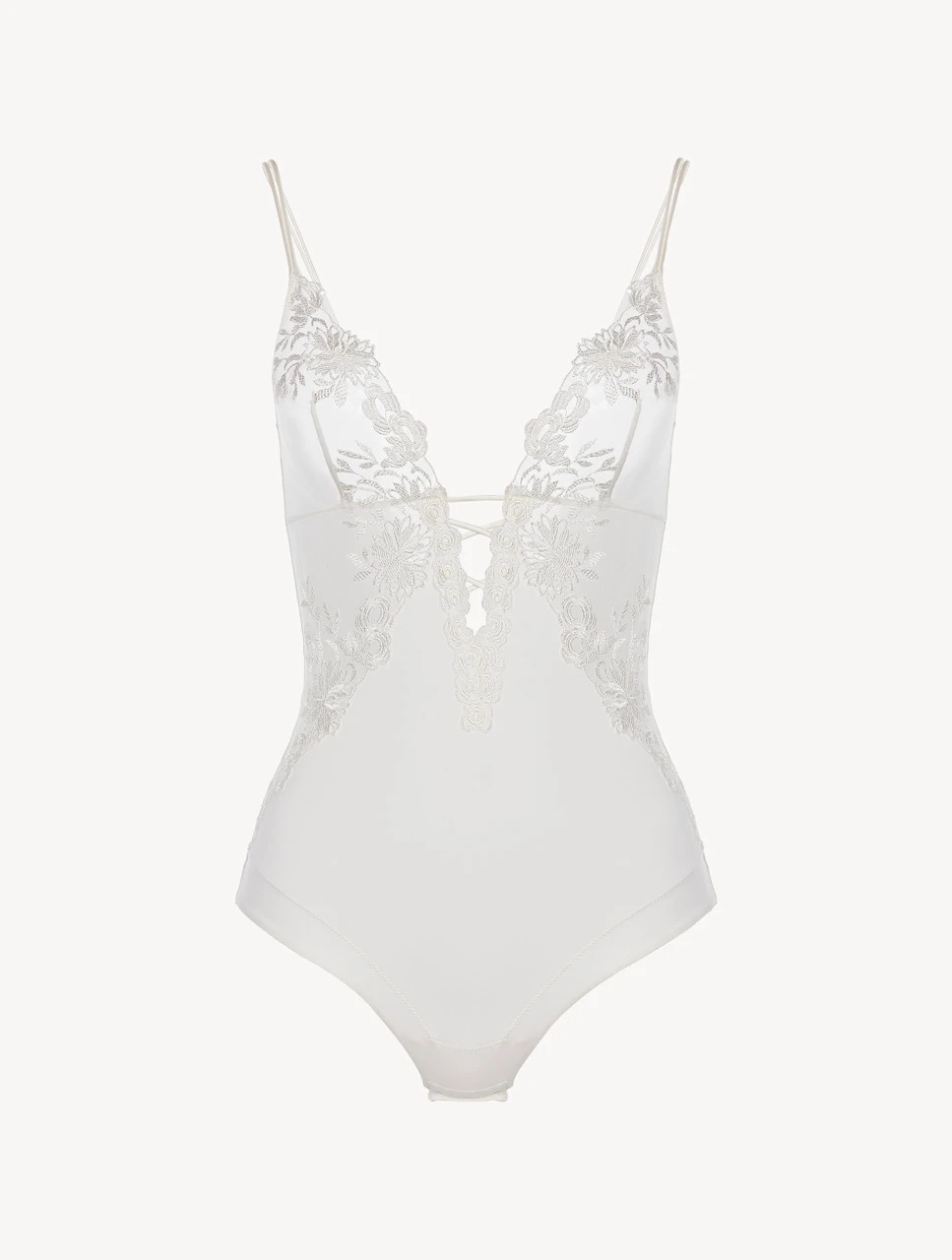 La collection «Zephyr» met en lumière la maîtrise des artisans La Perla en réinterprétant la tradition avec modernité. Une profusion de broderies florales et d’insertions transparentes apportent une touche précieuse aux modèles contemporains en Lycra®. Ce body souple sans armatures, par exemple, valorise les courbes grâce à ses insertions en tulle et à son décolleté plongeant rehaussé de délicates fleurs. L’entrelacs du devant et les fines bretelles réglables complètent le tout.