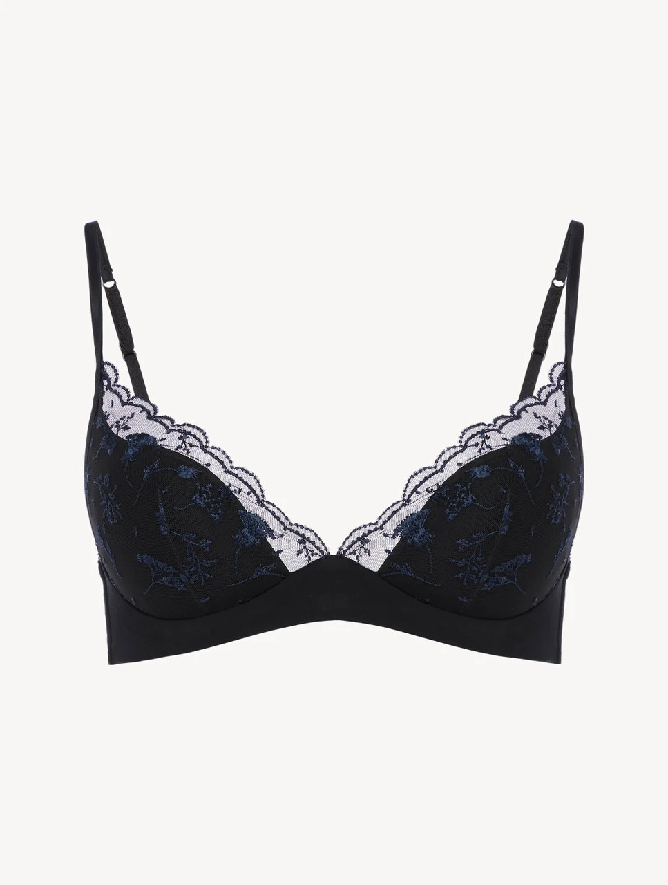 Un mélange puissant de féminité contemporaine et de luxe quotidien caractérise Midnight Botanica, la collection de classiques intemporels faits pour durer une vie, alliant des détails romantiques et des tissus qui suscitent l’envie impérieuse de les toucher. Cette brassière emboîtante extrêmement confortable, ampliforme et sans armatures est réalisée dans un splendide tulle élégamment brodé de fleurs. Portez-la avec un slip, un slip taille haute ou un string assorti, ou sous votre chemise préférée, juste assez déboutonnée pour en révéler un peu la dentelle et composer une tenue à la fois élégante et décontractée le jour comme le soir.