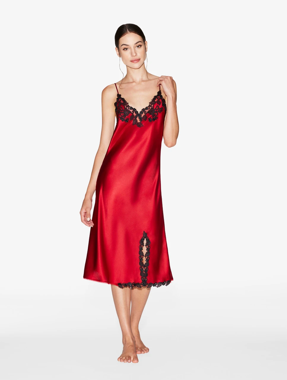 Réalisée dans un satin de soie rouge irrésistible, l’élégante chemise de nuit courte Maison est sublimée de délicates fleurs brodées sur une base en tulle et parachevée d’emblématiques broderies en guipure « frastaglio » noires exécutées artisanalement. Avec ses bretelles délicates et la fente discrète qui longe la jambe, elle incarne un raffinement intemporel et semble avoir vu le jour pour être jalousement conservée tout une vie durant. Associez-la à la robe de chambre coordonnée pour un look résolument impeccable.