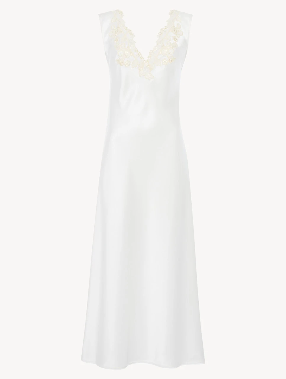 Réalisée dans un satin de soie blanc irrésistible, l’élégante chemise de nuit longue Maison est sublimée de délicates fleurs brodées sur une base en tulle et parachevée d’emblématiques broderies en guipure « frastaglio » ivoire exécutées artisanalement. Expression d’un raffinement intemporel, il s’agit d’une œuvre d’art à conserver jalousement tout une vie durant.