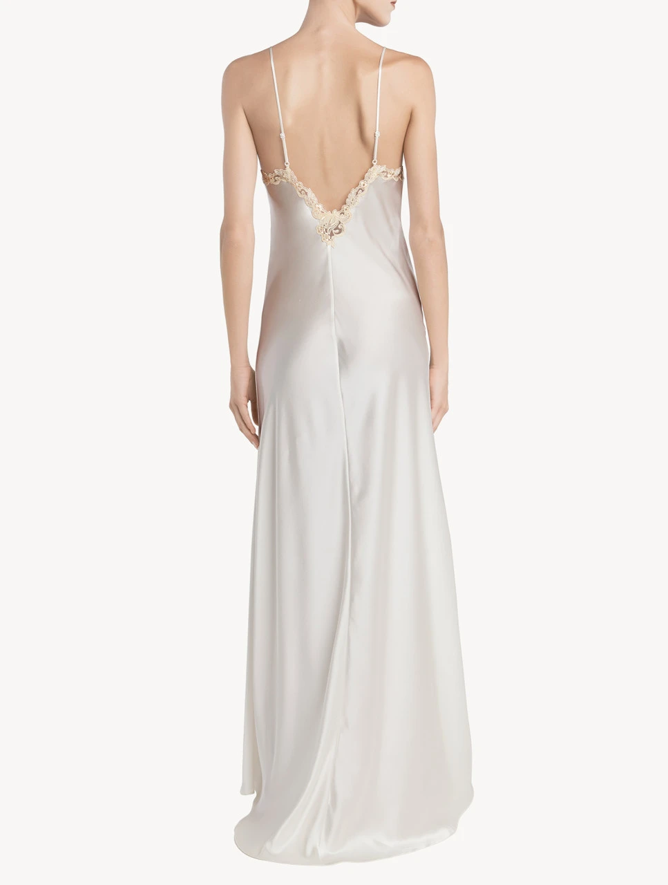 La version la plus précieuse de la collection La Perla Maison est caractérisée par des motifs brodés sur une base en tulle de la même couleur que la soie et finis à la main avec une double insertion de guipure «frastaglio». Chemise de nuit en satin de soie enrichie sur l’encolure par des motifs brodés à la main sur une base de tulle de même couleur que la soie, selon une technique de double «frastaglio». Cette réalisation reproduit l’effet de rameaux fleuris qui semblent grimper le long du corps. Moderne et précieux à la fois, ce modèle incarne la version la plus actuelle et raffinée de la collection La Perla Maison. Longueur 145 cm – Bretelles réglables – Made in Italy.