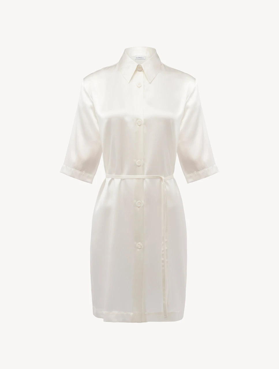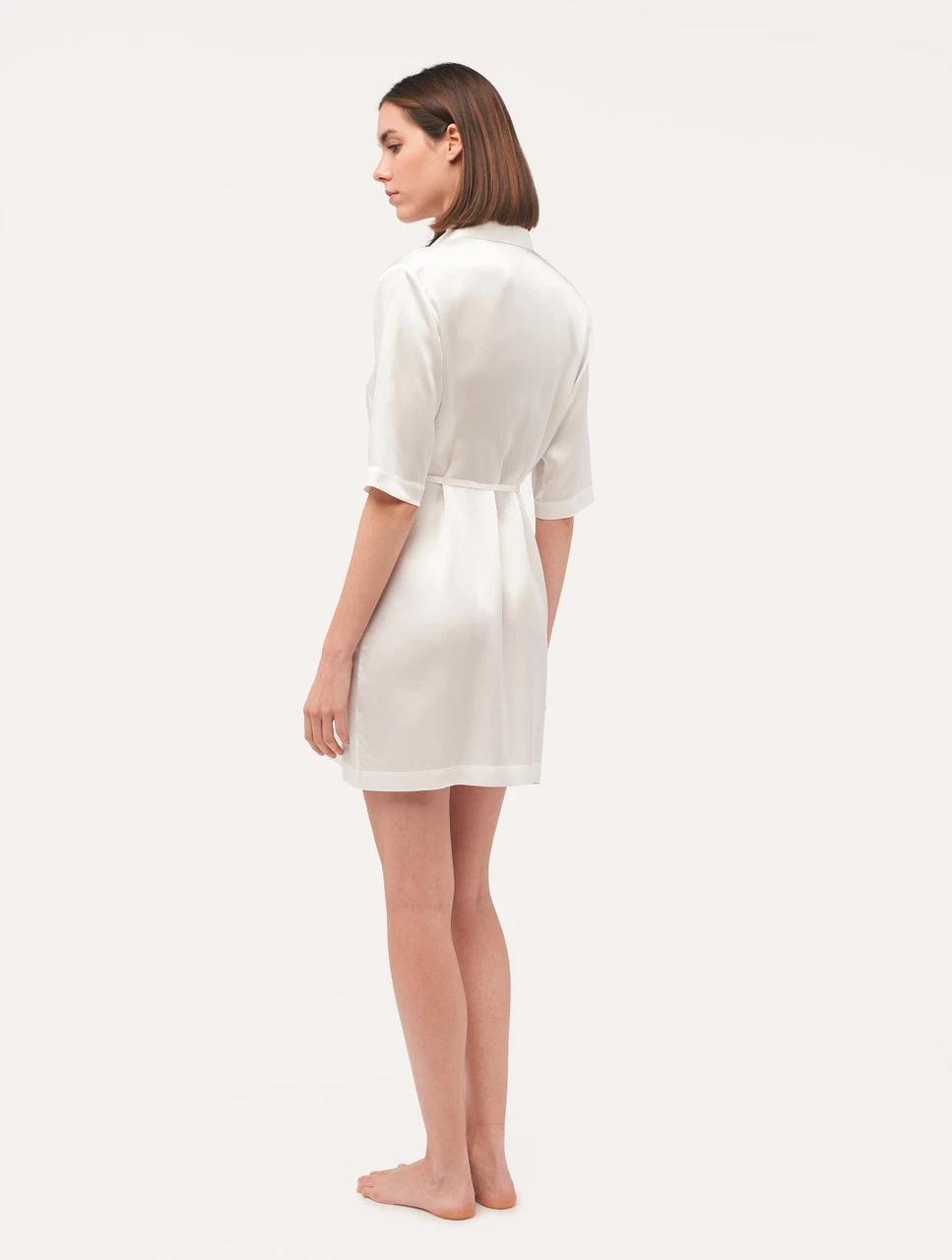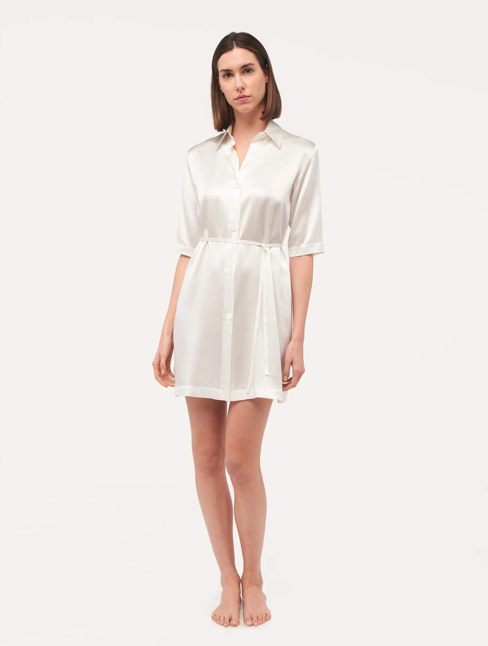 Cette collection de tenues de nuit en pur satin de soie d’une grande sobriété possède un charme inouï. Gage de confort la nuit, ces caressantes créations sont idéales aussi le jour, pour le plaisir de se lover dans le luxe. Cette chemise de nuit à la ligne décontractée arrive au-dessus du genou. Caractérisée par une fermeture par boutons et une ceinture assortie qui en resserre la taille, valorisant la silhouette.