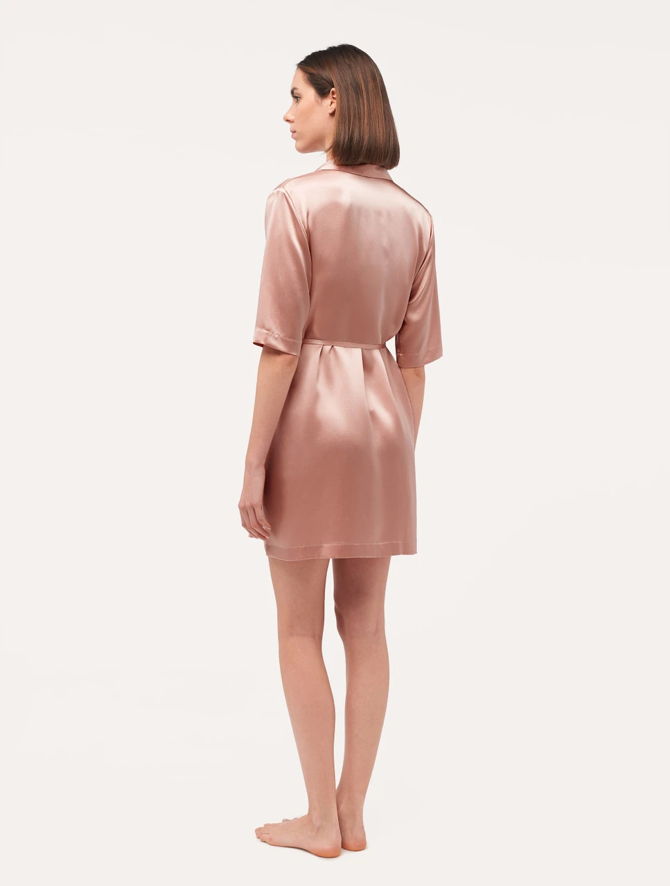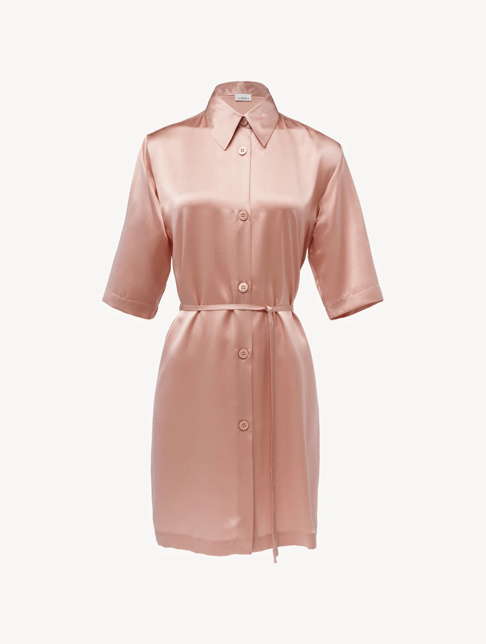 Cette collection de tenues de nuit en pur satin de soie d’une grande sobriété possède un charme inouï. Gage de confort la nuit, ces caressantes créations sont idéales aussi le jour, pour le plaisir de se lover dans le luxe. Cette chemise de nuit à la ligne décontractée arrive au-dessus du genou. Caractérisée par une fermeture par boutons et une ceinture assortie qui en resserre la taille, valorisant la silhouette.