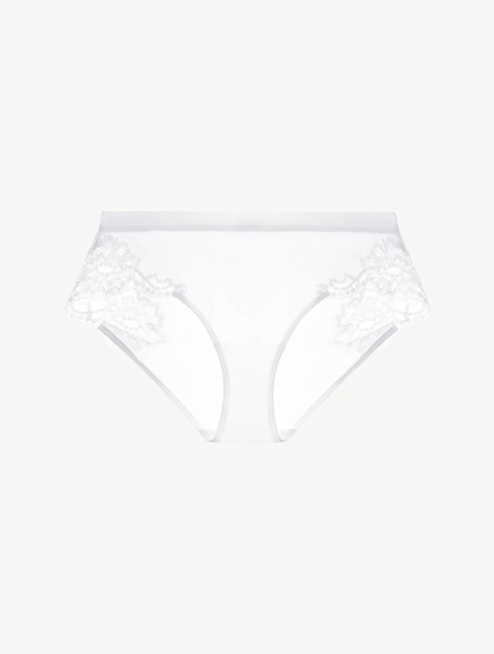 Culotte en jersey de coton stretch, une matière au toucher délicat et compact pour un sous-vêtement polyvalent, confortable et élégant. La pièce est rehaussée d’insertions en dentelle Leavers élastique avec des motifs floraux.