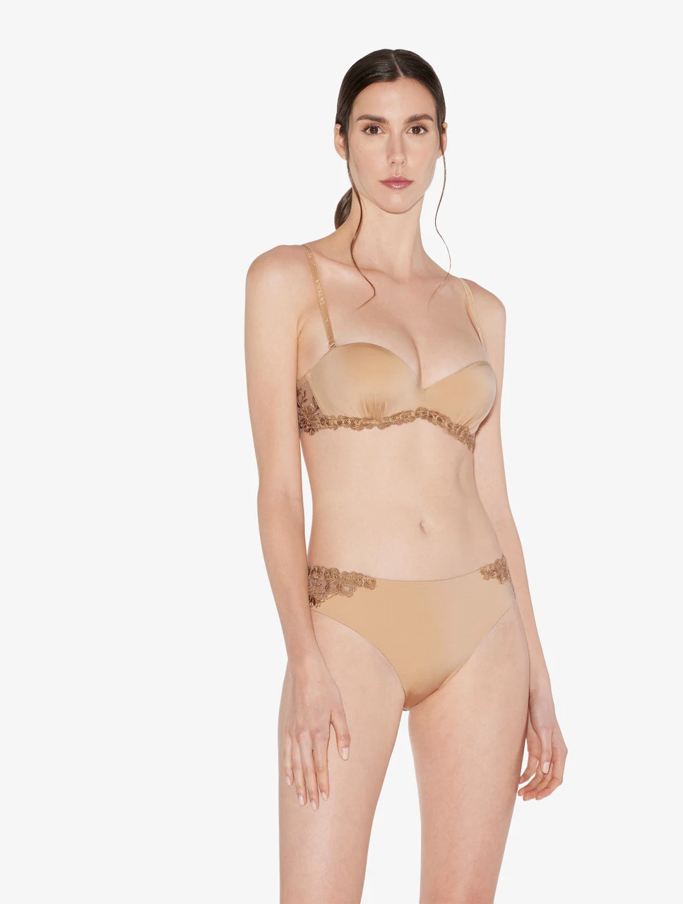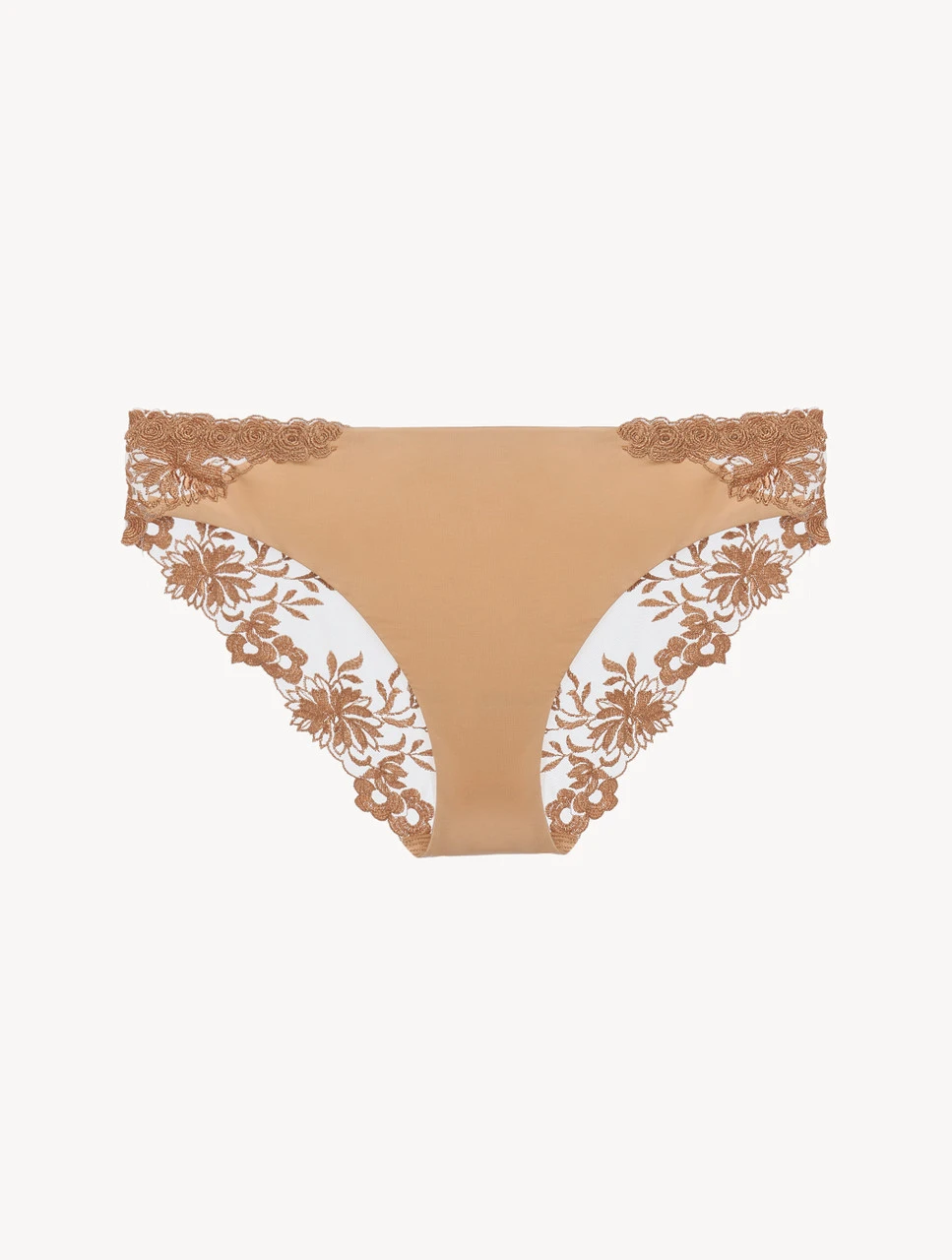 La collection «Zephyr» met en lumière la maîtrise des artisans La Perla en réinterprétant la tradition avec modernité. Une profusion de broderies florales et d’insertions transparentes apportent une touche précieuse aux modèles contemporains en Lycra®. Conçue pour tous les jours, cette culotte arbore un style romantique grâce à son tulle au dos et à son délicat motif de fleurs qui dansent sur la peau. Sa coupe régulière est moyennement couvrante.