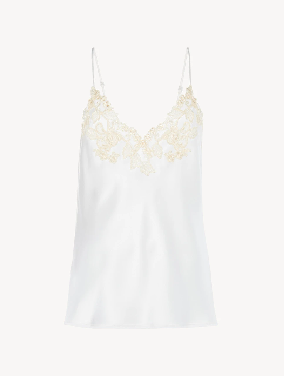 La version la plus précieuse de la collection La Perla Maison est caractérisée par des motifs brodés sur une base en tulle de la même couleur que la soie et finis à la main avec une double insertion de guipure «frastaglio». Top en satin de soie enrichi sur l’encolure par des motifs brodés à la main sur une base de tulle de même couleur que la soie, selon une technique de double «frastaglio». Cette réalisation reproduit l’effet de rameaux fleuris qui encadrent le décolleté. Moderne et précieux à la fois, ce modèle incarne la version la plus actuelle et raffinée de la collection La Perla Maison.