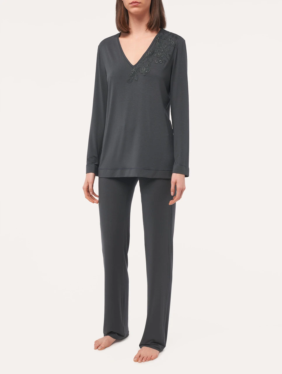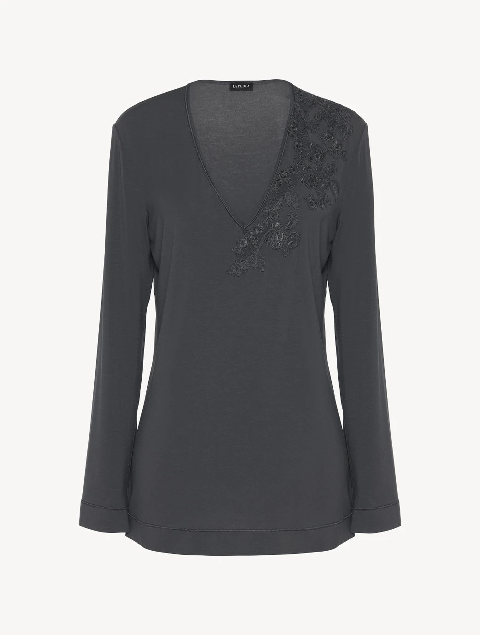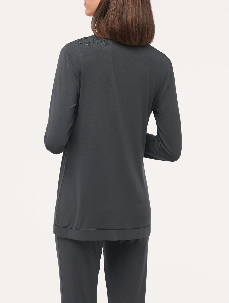 Composée d’élégants vêtements d’intérieur et de tenues de nuit, cette collection présente un équilibre unique entre style désinvolte et confort irrésistible. Réalisé en jersey modal doux et fluide, ce haut à manches longues est rehaussé du motif traditionnel Maison, délicatement brodé sur une base en tulle et appliqué à la main. Son tissu léger offre une merveilleuse sensation sur la peau nue, tandis que son décolleté plongeant en V lui donne un charme envoûtant.