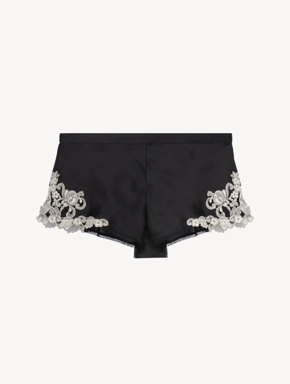 Short De Pyjama En Soie Noir Avec Finitions En Dentelle Leavers-Lingerie De Nuit En Soie-EXOTIQUE