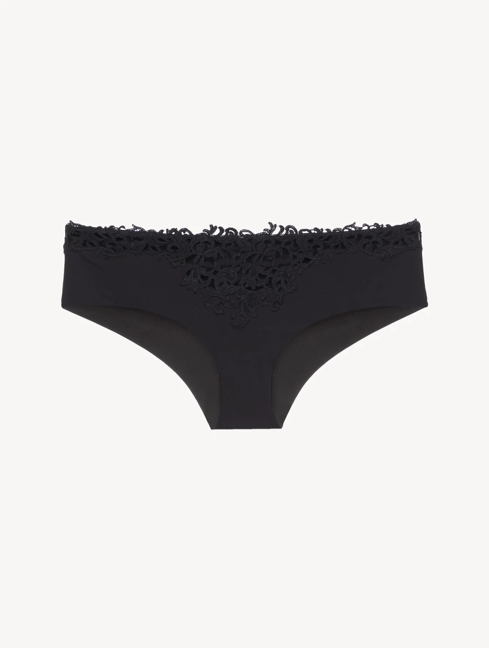 Shorty en Lycra® ultra léger enrichi d’éléments recherchés en macramé appliqués par guipures «frastaglio».