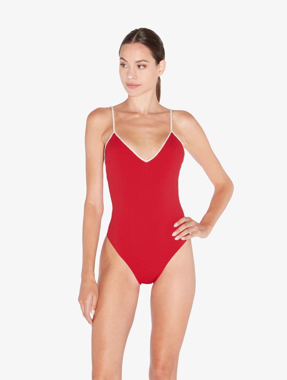Mêlant élégance, sophistication et esprit nautique contemporain, le maillot de bain rouge La Perla Signature est rehaussé de l’emblématique monogramme LP en jacquard stretch de couleur assortie. Avec sa coupe chic et moderne et son audacieuse encolure en V, il présente des bretelles en cordonnet de couleur contrastée qui lui donnent un indémodable style resort. Portez-le avec la combinaison ou la robe polo coordonnées.