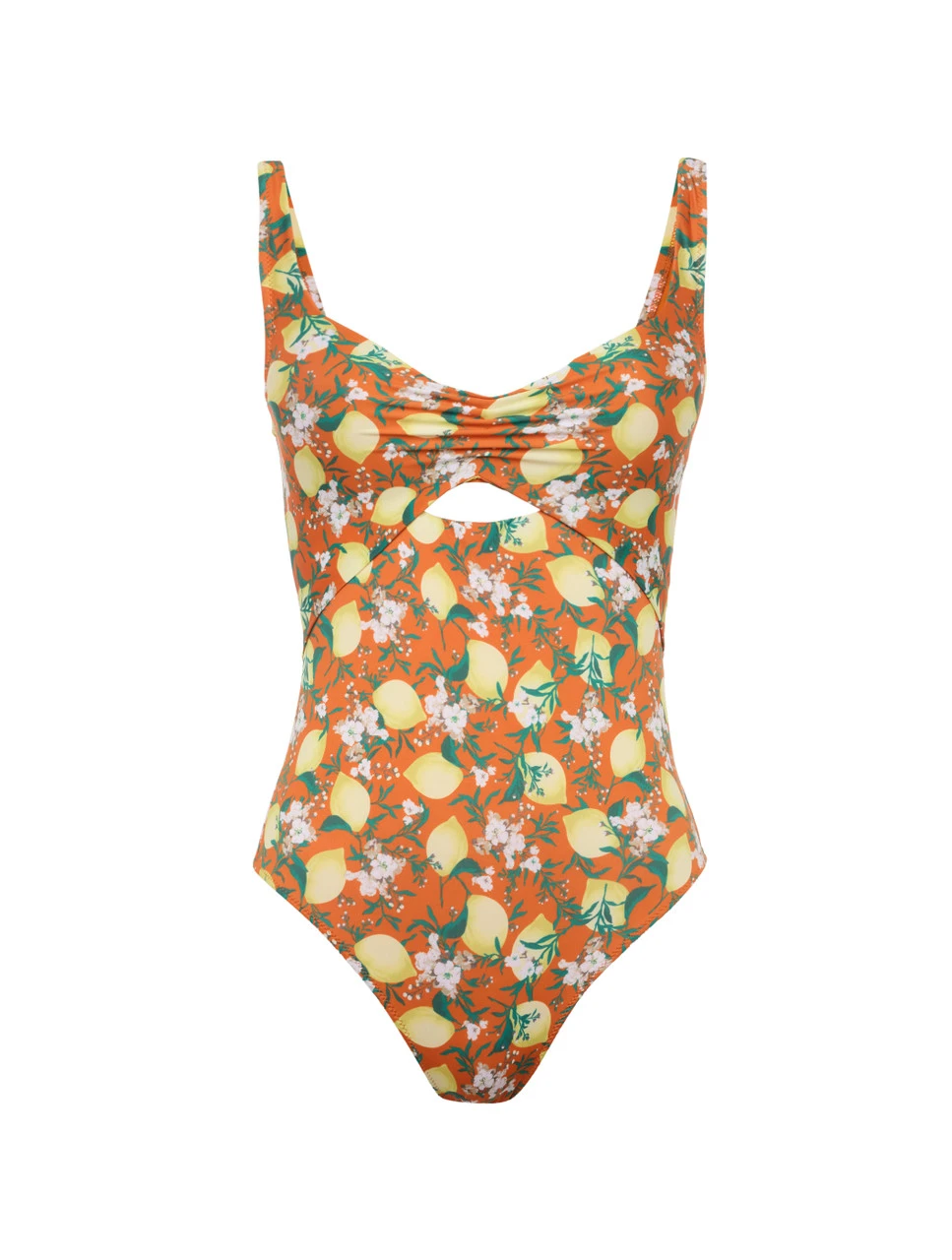 Inspiré de l’atmosphère irrésistible d’un été italien, le maillot de bain orange avec découpe Amalfi Twist présente un imprimé frais et vibrant ponctué de citrons et de fleurs. Ce splendide modèle aux lignes contemporaines avec armatures et coussinets amovibles présente une découpe frontale et un petit détail torsadé qui lui donne du cachet. Portez-le sous la robe courte ou longue coordonnée pour un look de vacances impeccable.