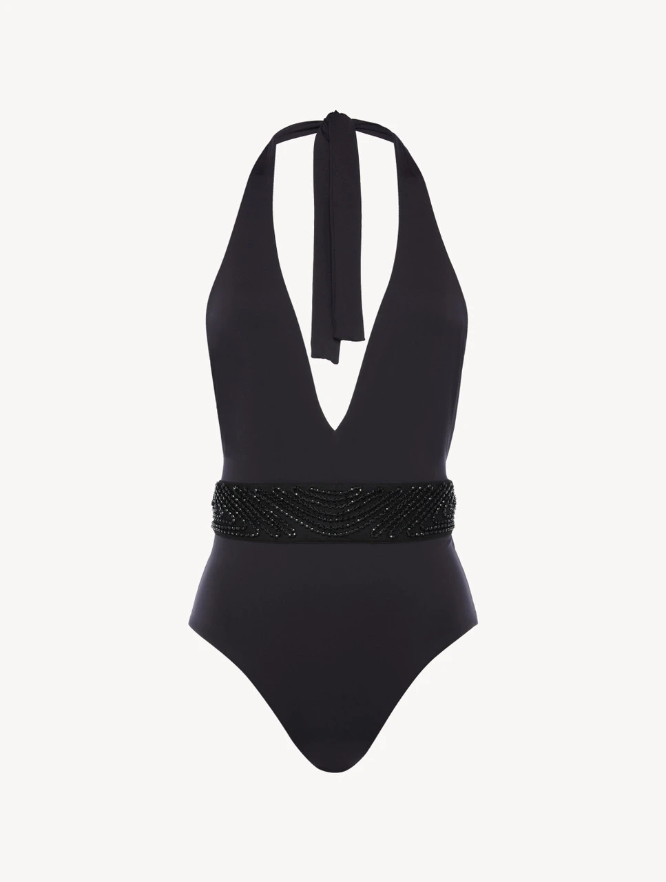 Expression d’une extrême sophistication et d’un savoir-faire exceptionnel, le maillot de bain noir Luci Di Capri puissamment féminin présente une ligne impeccable avec un décolleté halter et un dos nu avec laçage autour du cou. Réalisé dans une douce et luxueuse microfibre stretch qui sculpte et sublime la silhouette à la perfection, il est rehaussé d’une délicate garniture ondoyante de perles noires brodées sur tulle avec notre technique soutache. Portez-le sous l’impalpable caftan Luci Di Capri pour compléter votre look.