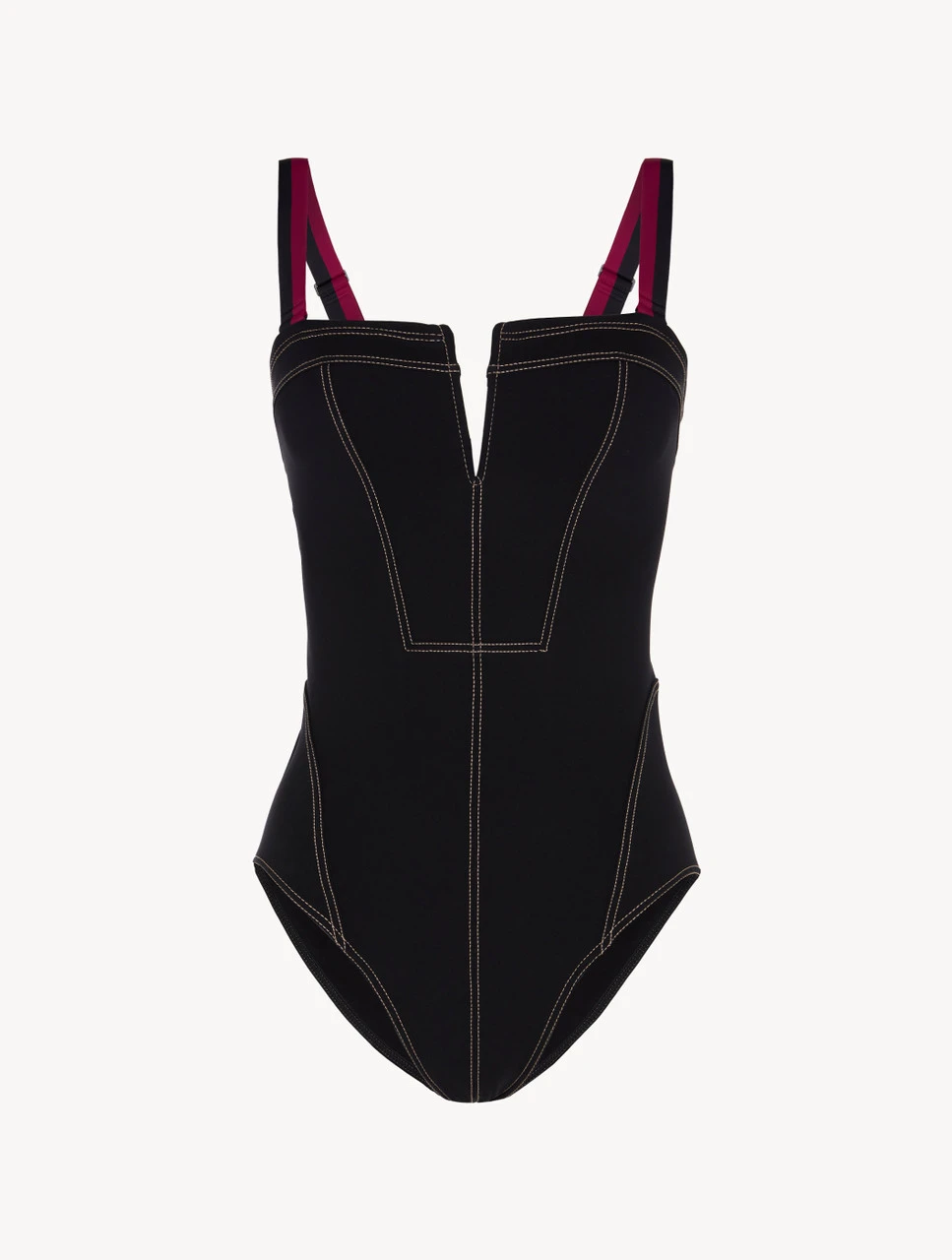 Associant des lignes impeccables et sophistiquées à des détails d’inspiration sportive, la collection When Summer Comes est conçue pour offrir un confort luxueux et sublimer votre silhouette afin que vous vous sentiez confiante à la plage comme à la piscine. Réalisé dans un superbe Lycra® stretch, ce maillot de bain une pièce de couleur noire sans armatures présente une coupe qui valorise la silhouette. Doté de coussinets amovibles, il est caractérisé par un décolleté en V à bord carré, des surpiqûres sculptantes de couleur contrastée et des bretelles bicolores réglables.