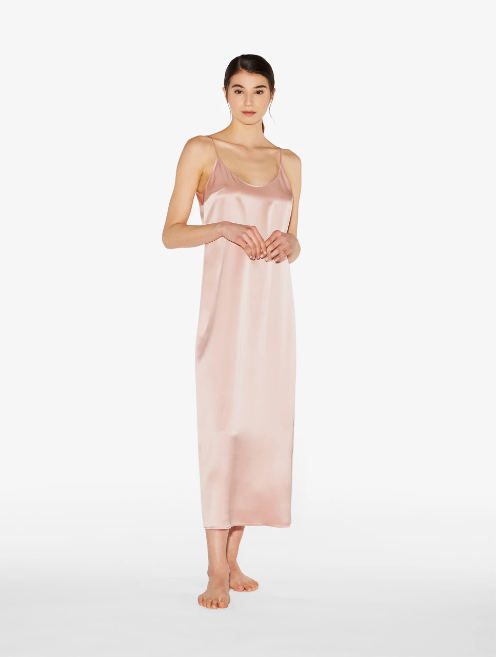 Douce et élégante, cette nuisette longue en pur satin de soie caresse délicatement les courbes. Une pièce simple, déclinée dans une sophistiquée tonalité rose poudré, dotée de fines bretelles réglables et d’une tenue confortable qui sublime la silhouette grâce à ses lignes élancées. L’encolure ronde et la profonde fente centrale à l’arrière créent un intrigant effet transparent, conférant au modèle une touche de sensualité. À associer à la robe de chambre extra-longue coordonnée, pour une tenue de nuit essentielle et raffinée.