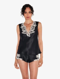 Top En Satin De Soie Noir Avec Broderie En Guipure « frastaglio »-Lingerie De Nuit En Soie-MAISON