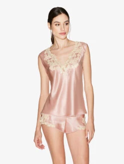 Short Rose En Soie Avec Dentelle Leavers-Lingerie De Nuit En Soie-PER LEI