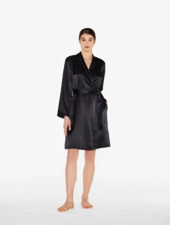 Robe Chambre Courte En Soie Noire-Lingerie De Nuit En Soie-SILK