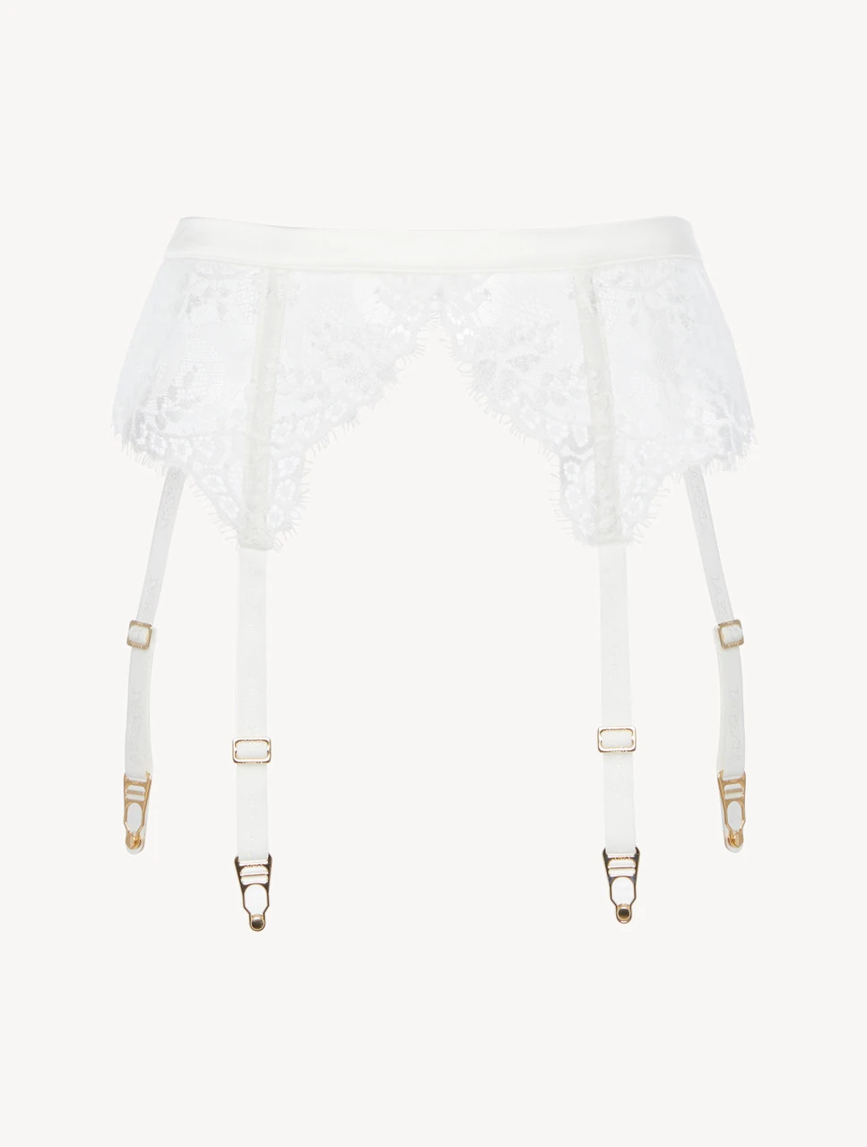 Un porte-jarretelles exclusif en dentelle Leavers stretch qui descend de la taille en de séduisantes insertions. L’élégant entrelacement de broderies de la dentelle crée un magnifique motif floral qui serpente sur la peau dans un séduisant effet diaphane. Un délicat bord festonné complète cette pièce.