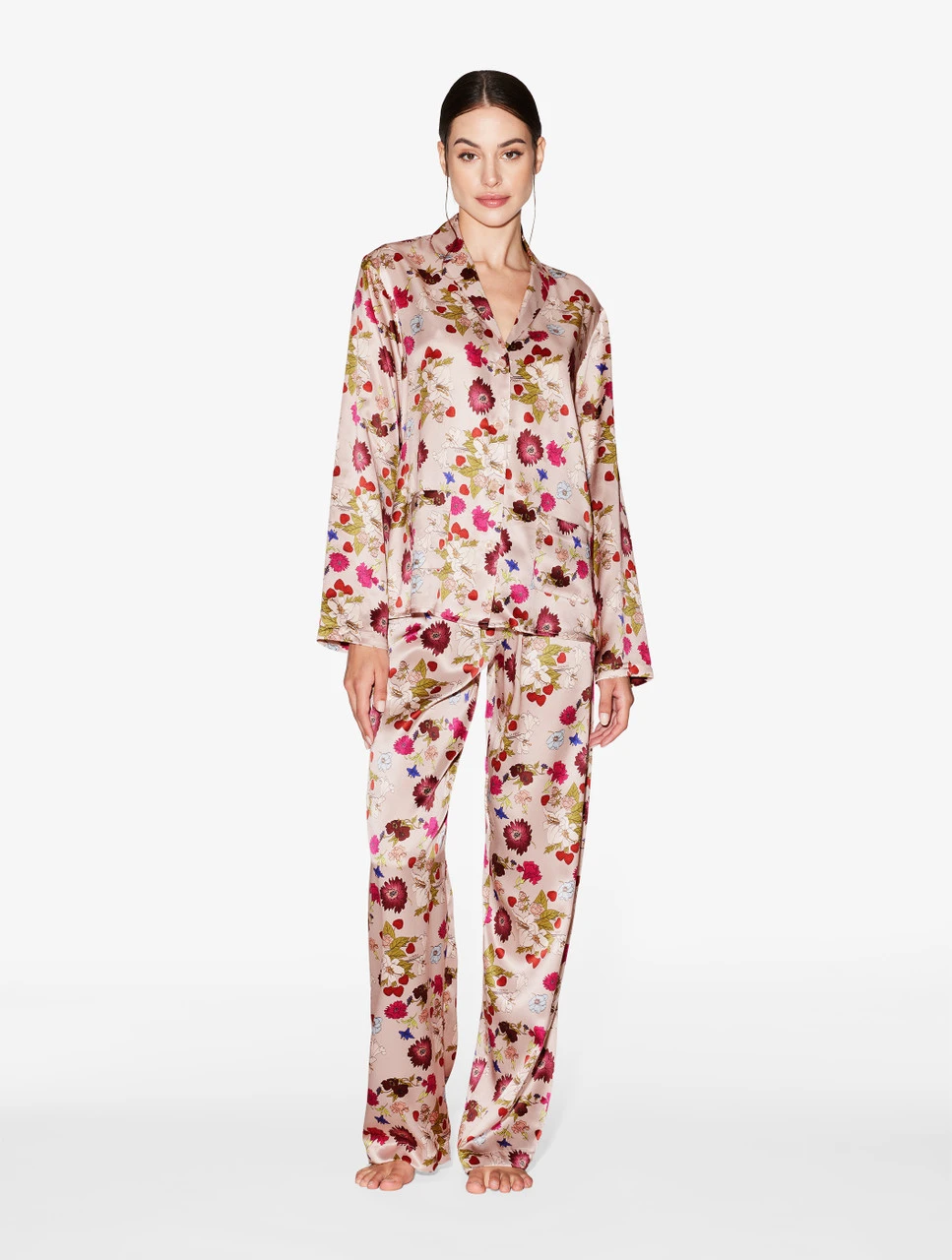 Réalisé dans une soie douce et somptueuse déclinée dans un motif floral romantique, ce pyjama indémodable vous offre l’équilibre idéal entre élégance et confort. Composé d’une veste boutonnée et d’un pantalon doux, ce pyjama peut être associé à la robe de chambre assortie pour une soirée détente à la maison ou porté avec une paire de talons hauts et des pièces élégantes pour créer un style désinvolte à adopter du matin jusqu’au soir.