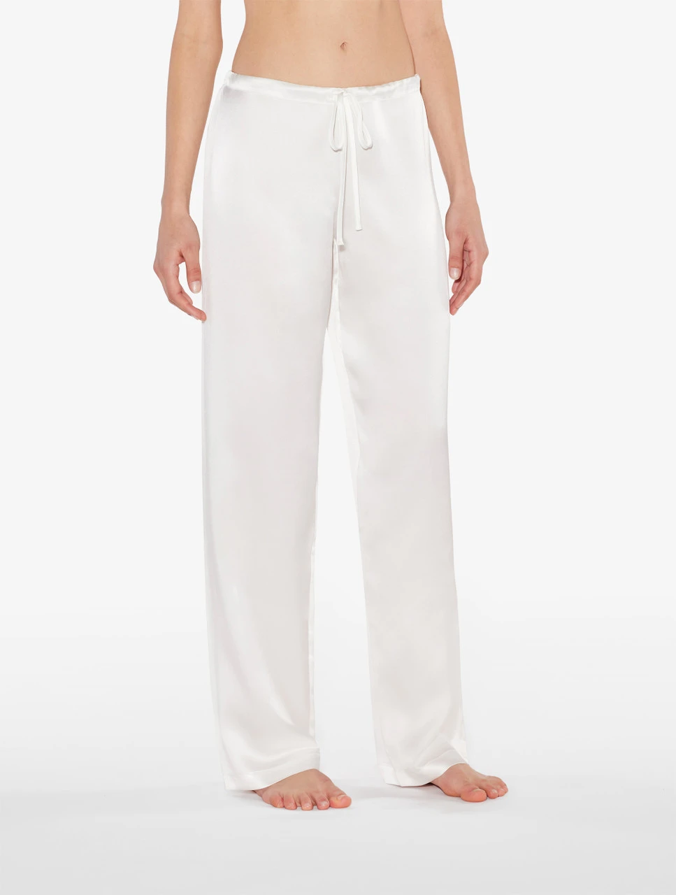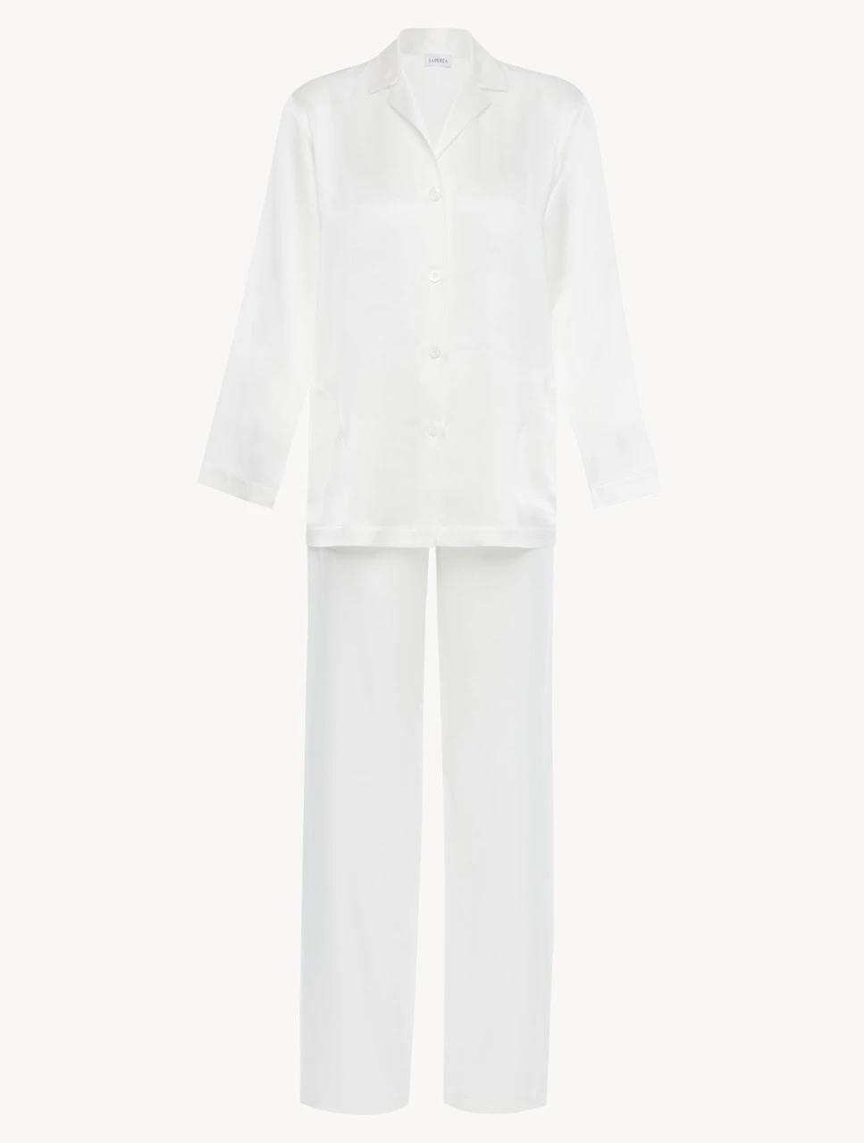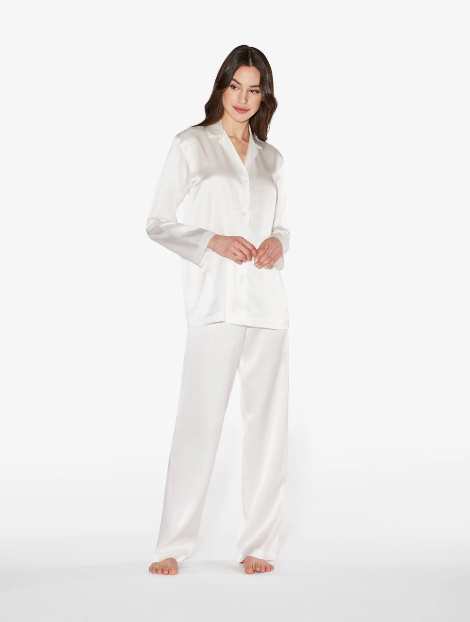 Pyjama classique en pur satin de soie. Un pyjama léger et brillant, composé d’une chemise avec col et boutons et d’un pantalon avec cordon coulissant pour un ensemble de nuit essentiel et sophistiqué au charme ultra-féminin. La coupe longue et décontractée du pantalon et la douceur du satin de soie sur la peau le rendent exceptionnellement confortable et parfait en toutes saisons. À associer à la robe de chambre longue en soie coordonnée.