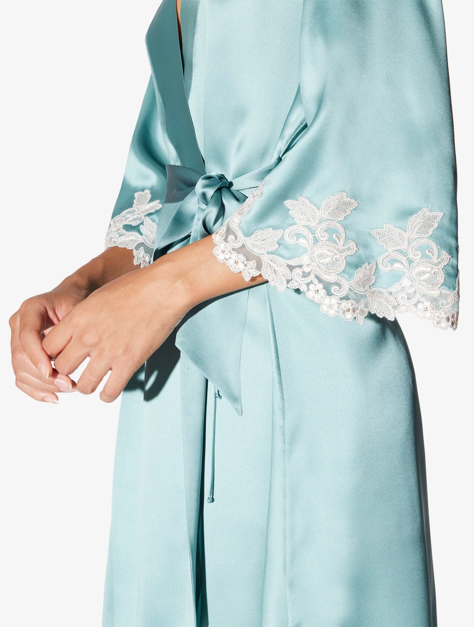 La collection « La Perla Maison » incarne à la perfection l’authenticité de l’esprit Made in Italy dont elle est issue. Cette pièce précieuse et exclusive, caractérisée par une antique technique florentine de broderie appliquée à la main, peut nécessiter jusqu’à deux jours de travail artisanal. Réalisée en satin de soie ultraléger de couleur vert amande, la robe de chambre Maison est aussi raffinée qu’exclusive. Cet élégant modèle portefeuille est rehaussé d’une magnifique broderie en guipure « frastaglio » effet métallisé appliquée à la main sur les manches. La délicate ceinture apporte une touche de sensualité à l’ensemble. Portez-la avec la slip dress assortie pour créer un look au charme intemporel.