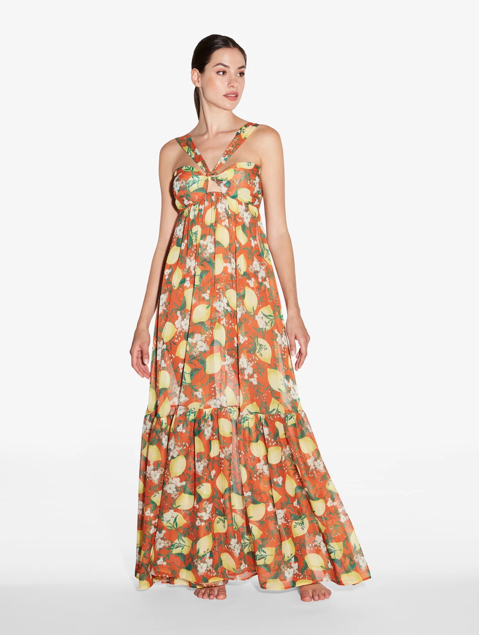 Inspirée de l’atmosphère irrésistible d’un été italien, la robe maxi orange Amalfi Twist présente un imprimé frais et vibrant ponctué de citrons et de fleurs. Ce modèle intemporel sublimant la silhouette est rehaussé de découpes contemporaines et d’une coupe dos nu avec laçage dans le dos. Conçue dans un souci de polyvalence, portez-la en guise de tenue de plage sur votre splendide maillot de bain, avec des sandales ou encore avec des talons hauts pour composer un look parfaitement élégant le jour comme le soir.