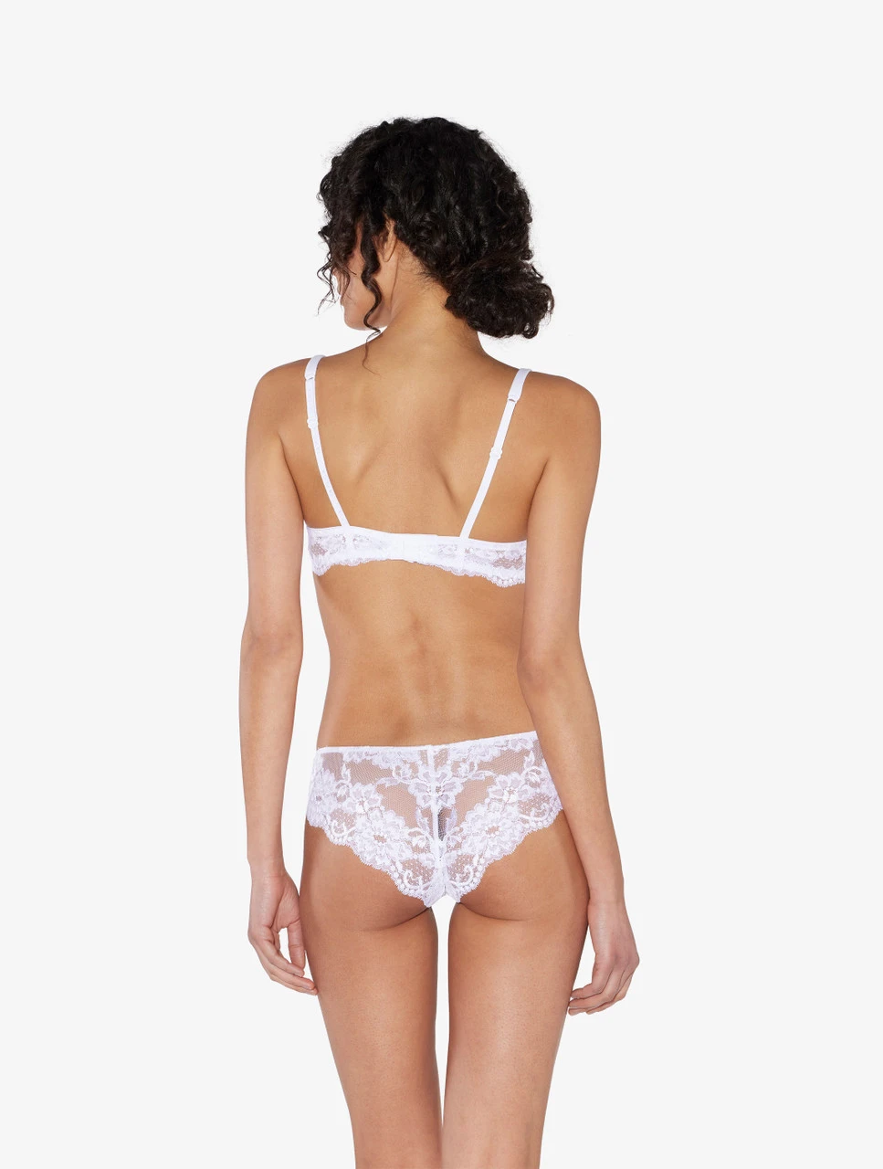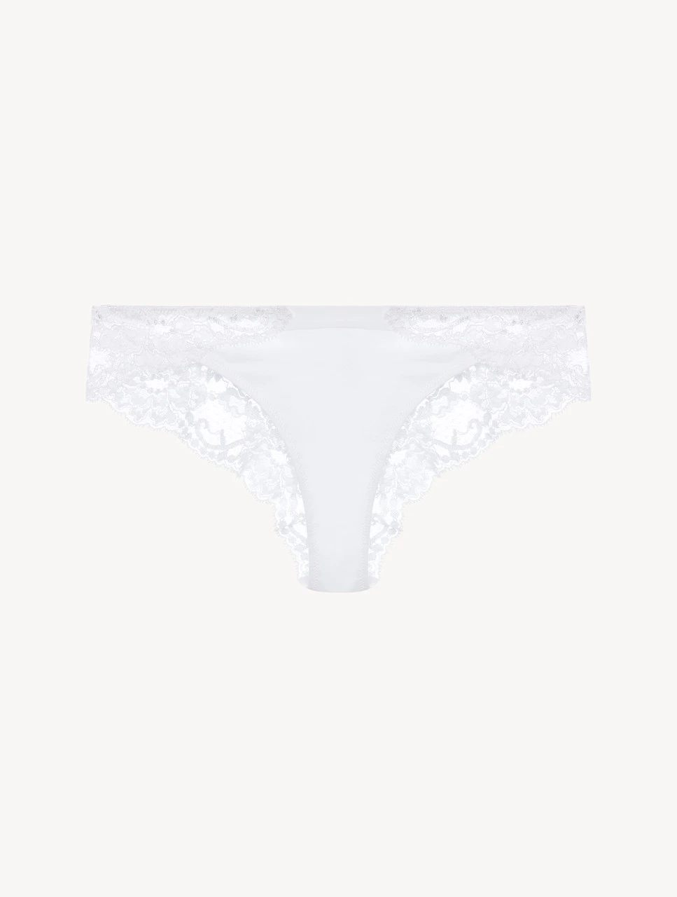 Slip brésilien en dentelle Leavers élastique avec des motifs floraux et jersey de coton stretch. Un sous-vêtement polyvalent, confortable et élégant.