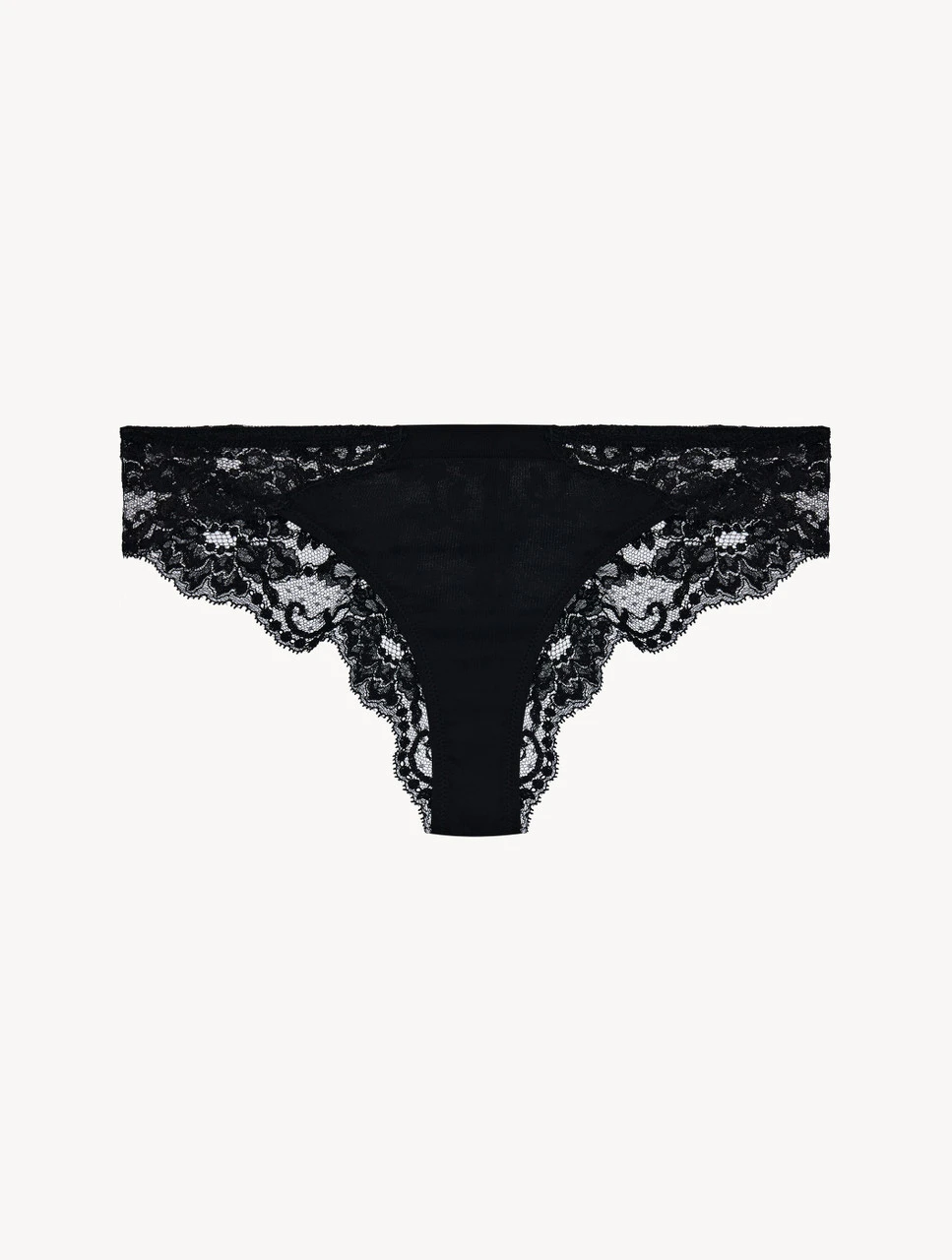Slip brésilien en dentelle Leavers élastique avec des motifs floraux et jersey de coton stretch. Un sous-vêtement polyvalent, confortable et élégant.