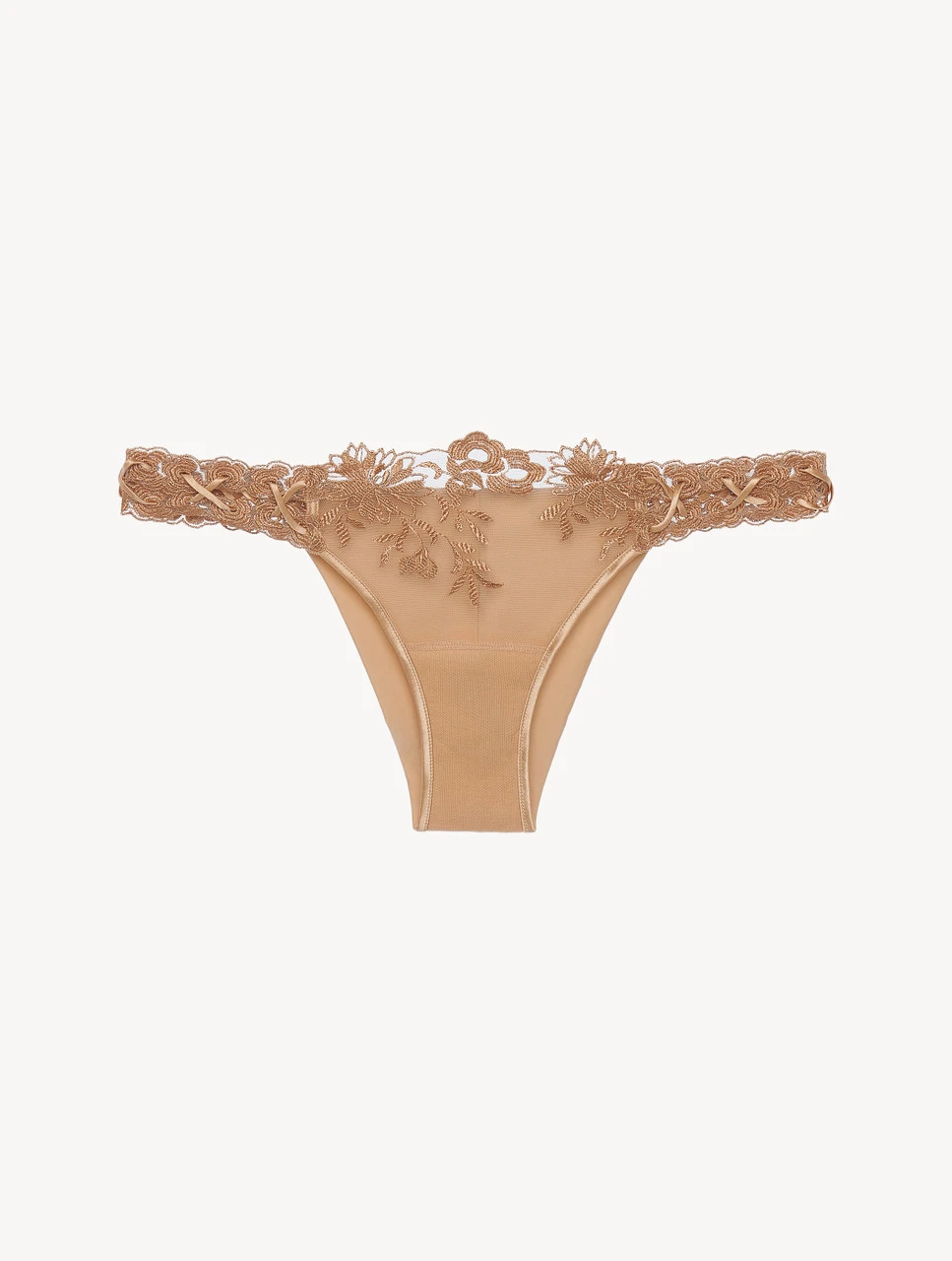 La collection «Zephyr» met en lumière la maîtrise des artisans La Perla en réinterprétant la tradition avec modernité. Une profusion de broderies florales et d’insertions transparentes apportent une touche précieuse aux modèles contemporains en Lycra®. Ce slip brésilien en tulle est orné de délicates fleurs qui semblent danser sur la peau. Avec sa taille basse et son dos en Lycra® doux, ce slip est indétectable sous les vêtements les plus moulants.