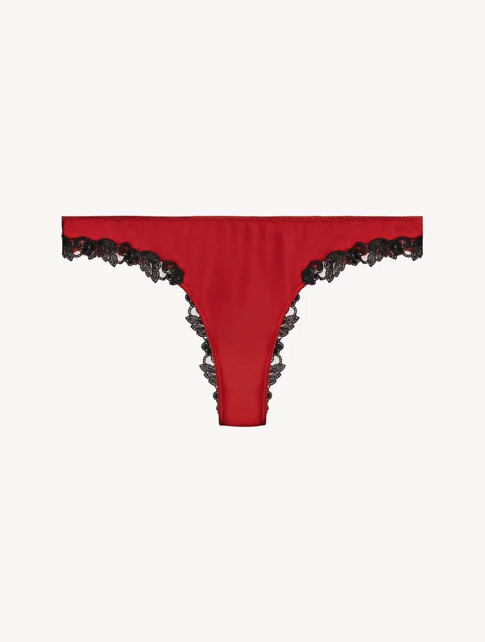 Ce slip brésilien est la nouveauté de la collection iconique «Maison», l’une des plus prisées de la marque. Cette pièce en luxueux satin de soie est ornée artisanalement d’une double guipure «frastaglio» créant un motif de fleurs grimpantes. Une création moderne et élégante, qui représente à merveille la toute nouvelle proposition de cette collection. Sa coupe échancrée à taille basse est idéale pour élancer la silhouette.