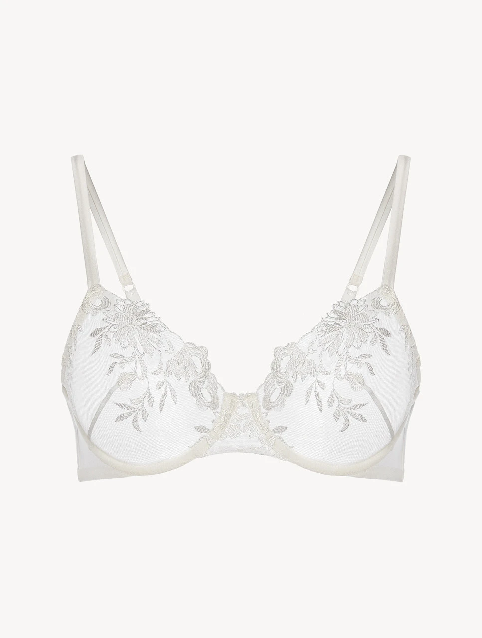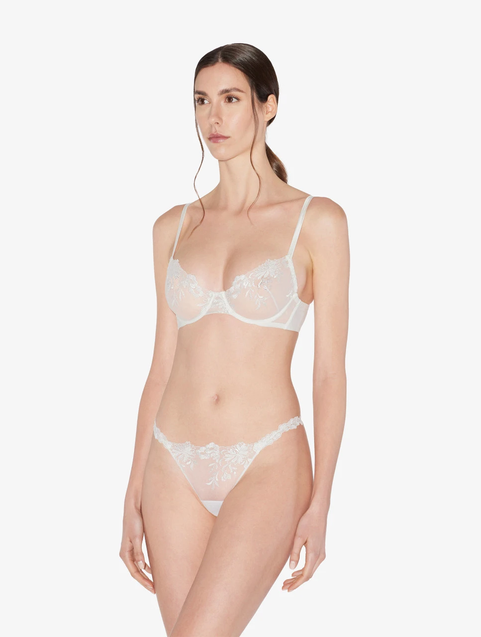 La collection «Zephyr» met en lumière la maîtrise des artisans La Perla en réinterprétant la tradition avec modernité. Une profusion de broderies florales et d’insertions transparentes apportent une touche précieuse aux modèles contemporains en Lycra®. Réalisé dans une précieux tulle, ce soutien-gorge est orné d’un délicat motif de fleurs. Ses armatures apportent un excellent soutien et ses bonnets souples sans coussinets allient confort et sensualité.