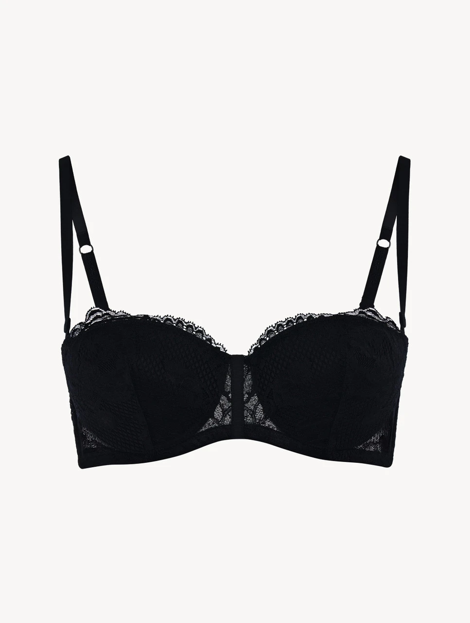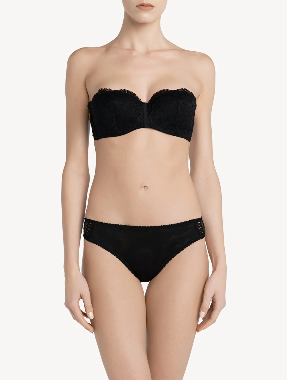 Ce soutien-gorge bandeau en dentelle Leavers stretch est idéal sous les décolletés les plus audacieux. Sa ligne à armatures et bonnets légèrement ampliformes garantit un maintien optimal et respecte le galbe naturel de la poitrine.