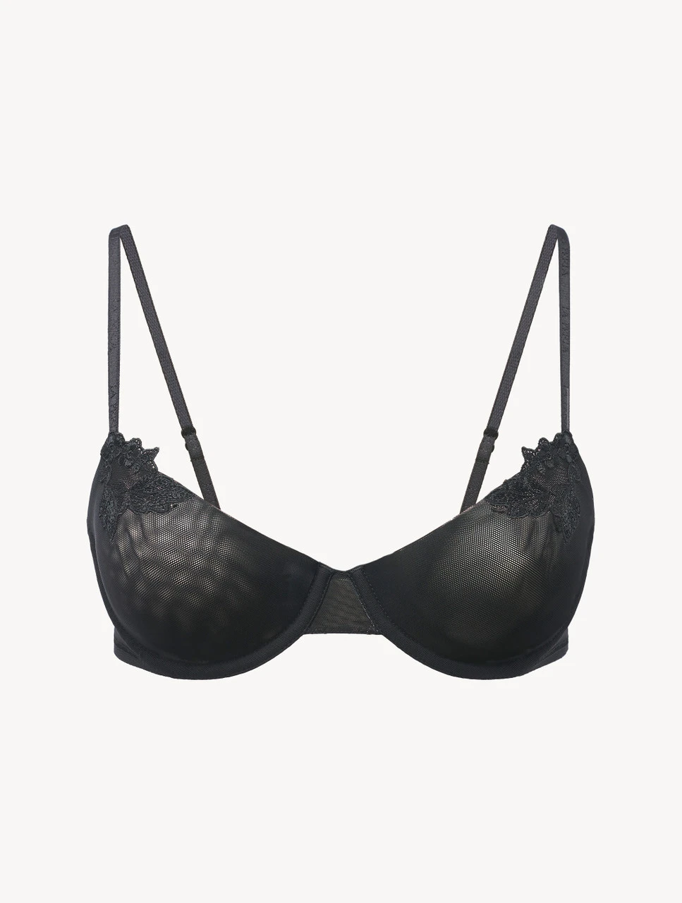 La collection « Maison Contouring » propose une alternative irrĂ©sistiblement confortable Ă la lingerie sculptante traditionnelle, comme ce soutien-gorge corbeille en doux tulle stretch, rehaussĂ© de broderies exclusives inspirĂ©es de la collection iconique « Maison ». Ses armatures soutiennent Ă la perfection et ses bonnets non ampliformes ornĂ©s dâune finition transparente respectent le galbe naturelle de la poitrine.