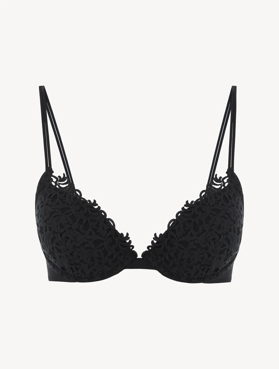 La précieuse finition en macramé recouvre les bonnets du soutien-gorge push-up et encadre le décolleté.