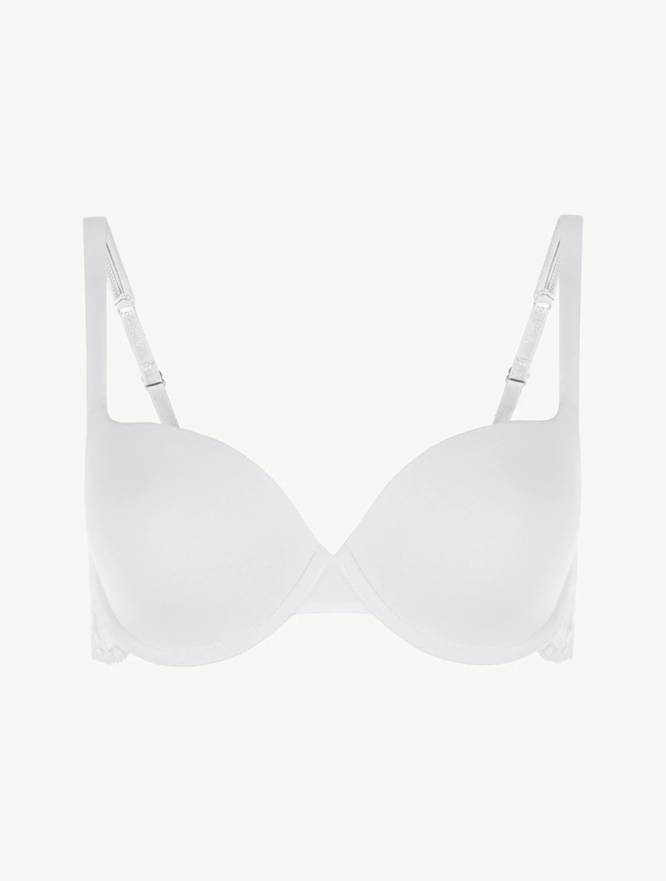 Soutien-gorge avec bonnets recouverts en jersey de coton stretch. Les côtés sont en dentelle Leavers élastique avec des motifs floraux.