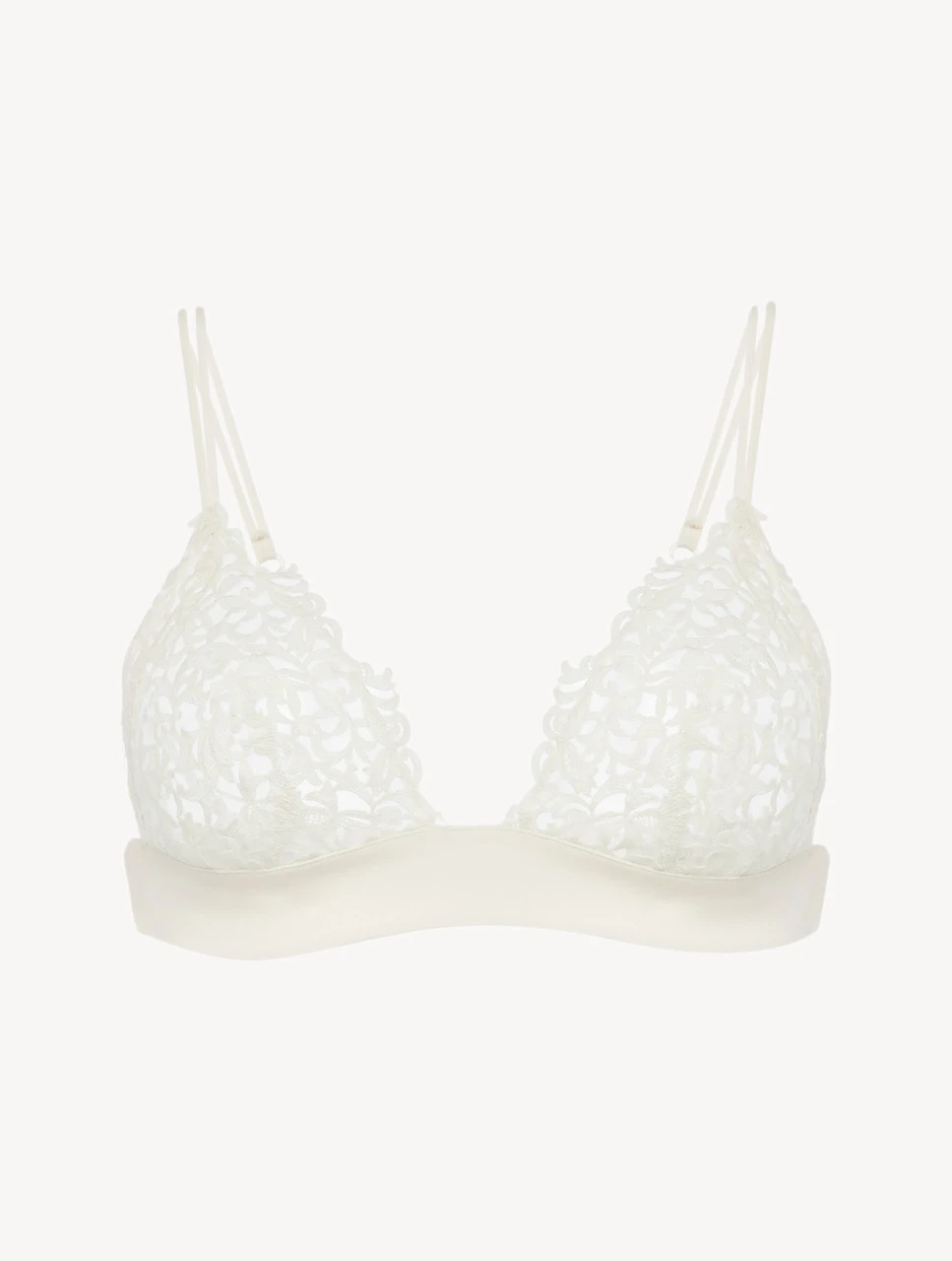 Précieux soutien-gorge triangle en macramé avec finition en georgette de soie stretch.