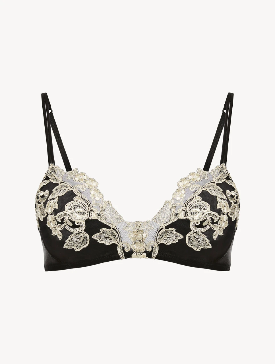 La collection emblématique «Maison» est une ode de la marque à l’inégalable savoir-faire artisanal italien et aux matières les plus précieuses. Ce soutien-gorge extrêmement raffiné présente une broderie sur tulle rehaussée d’une double guipure «frastaglio», réalisée à la main, qui donne vie à un motif de fleurs entourant le décolleté. Une création moderne et élégante, qui représente à merveille la toute nouvelle proposition de cette collection. Sa structure sans armatures et à bonnets souples est un gage de confort sans pareil.