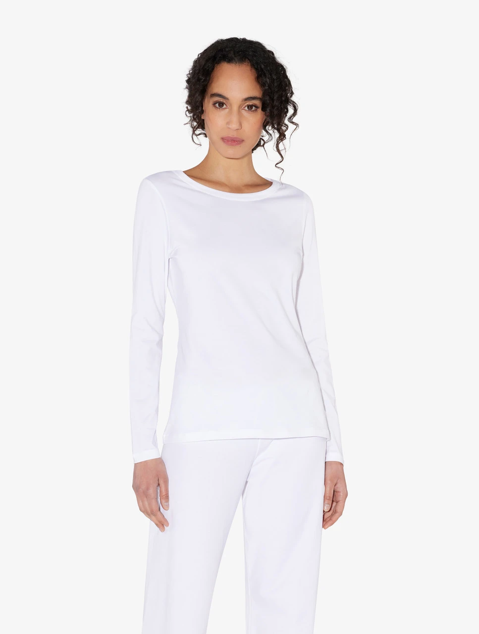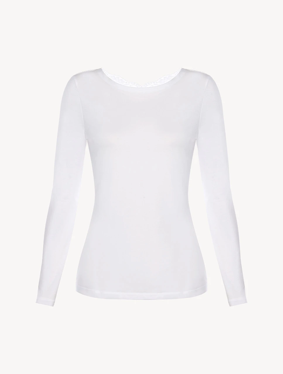 Ce t-shirt à manches longues de la collection «Souple» est irrésistiblement doux au toucher. Réalisé en jersey de coton stretch confortable et respirant, il est orné d’un motif floral en dentelle Leavers stretch derrière le cou.